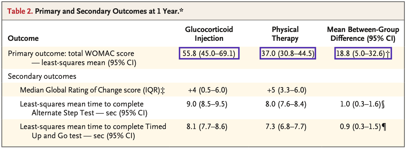 شارك في الدراسة 156 مريضًا؛ وكانت نسبة الذكور إلى الإناث متساوية عمليًا وكان متوسط مؤشر كتلة الجسم 31.5. تلقى المرضى في مجموعة GCI متوسط 2.6 حقنة. تلقى المرضى في مجموعة العلاج الطبيعي متوسط 11.8 جلسة علاجية. كما تلقى تسعة في المئة من مجموعة العلاج الطبيعي حقنة. وعلى العكس من ذلك، تلقى 18% من مجموعة GCI العلاج الطبيعي أيضًا.