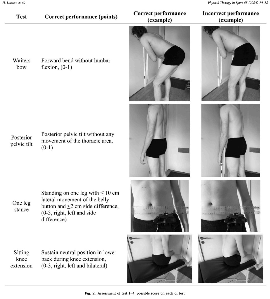 За да оценят контрола на лумбопелвикалните движения при състезателите по силов трибой, авторите използват тестова батерия, описана от Luomajoki et al. (2007 г. и 2008 г.) за тяхното кръстосано проучване. Накратко, тази тестова батерия се състоеше от 7 теста: