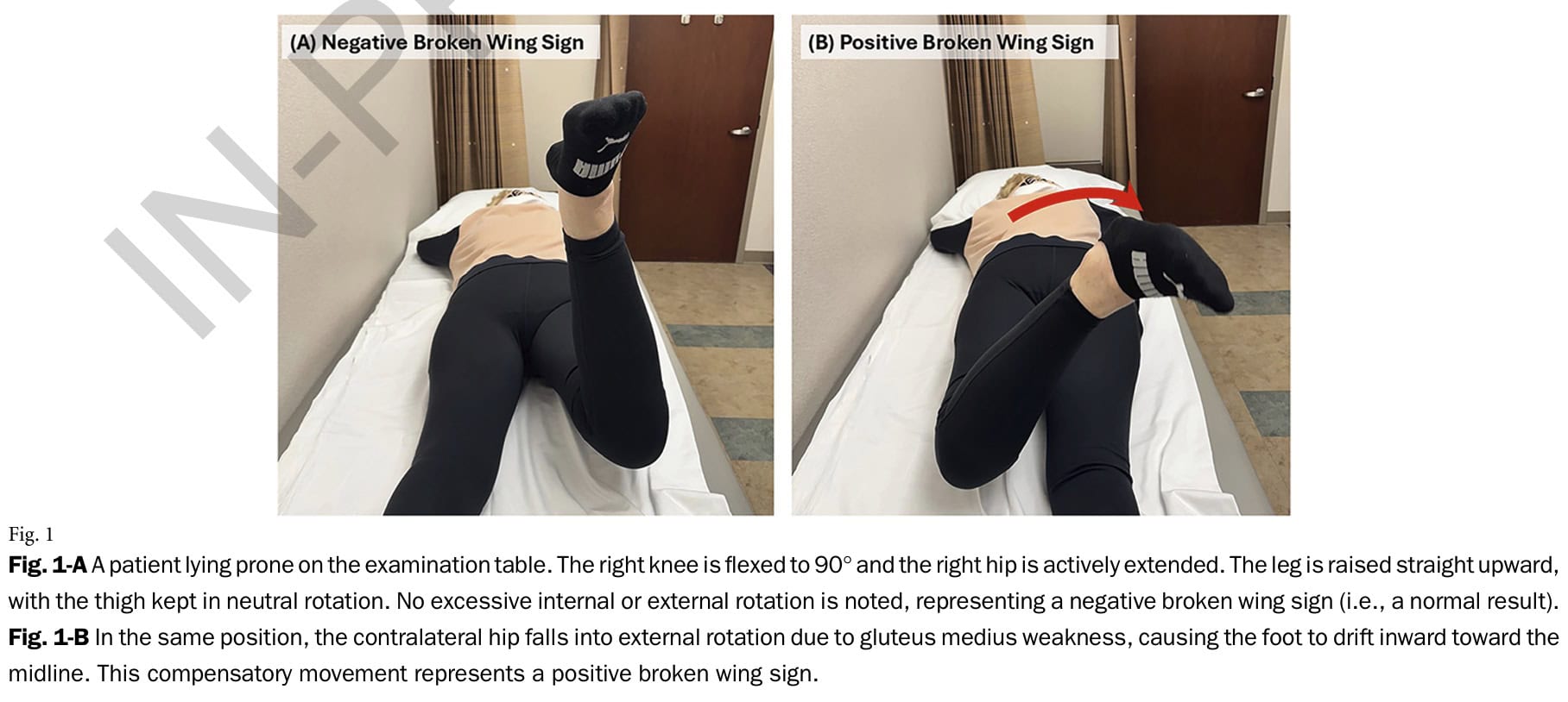 Znak zlomeného křídla nabízí jednoduchý a praktický způsob diagnostiky natržení nebo oslabení šlachy gluteus medius, zejména u pacientů, kteří nesnesou testy ve stoje, jako je Trendelenburgův znak. Když se kyčelní kloub během extenze v předklonu zevně otáčí, signalizuje to, že gluteus maximus přetlačuje slabý nebo natržený gluteus medius, což je jasný znak insuficience abduktorů.