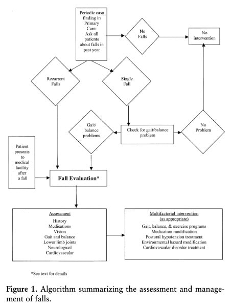 Na klinice prevence pádů jim bylo provedeno posouzení rizika pádu, včetně lékařského vyšetření a ošetření geriatrem, na základě pokynů Americké geriatrické společnosti pro prevenci pádů. Ta se řídila následujícím algoritmem a v této studii byla označena jako standardní cesta péče a mohla zahrnovat úpravu medikace, doporučení ohledně životního stylu a v případě potřeby doporučení k dalším zdravotnickým pracovníkům.