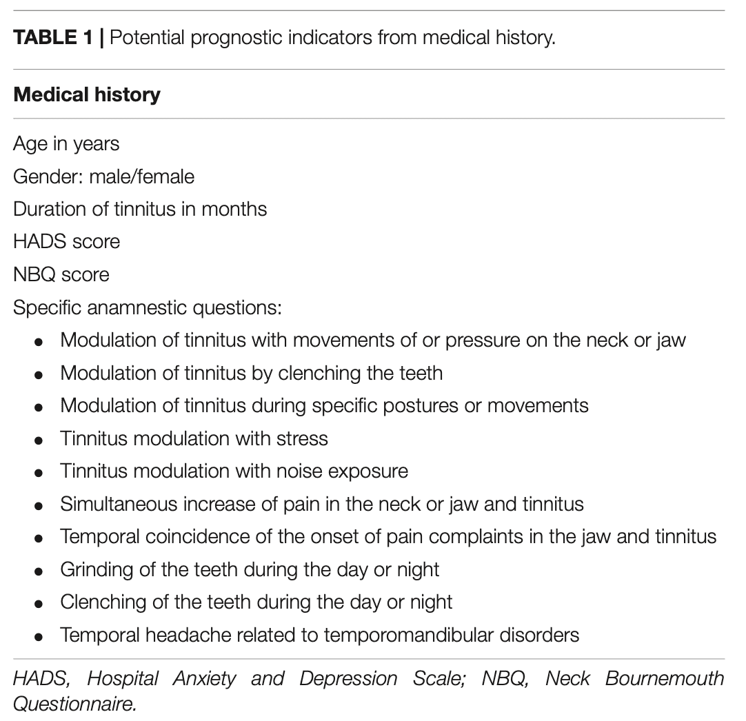 S ohledem na TFI byly jako faktory předpovídající pozitivní výsledek u tinnitu identifikovány věk, pohlaví a délka trvání tinnitu. Mladší věk, kratší trvání obtíží s tinnitem a skutečnost, že se jedná o ženu, mohly předpovídat klinicky významné snížení TFI v 68,1 %.
