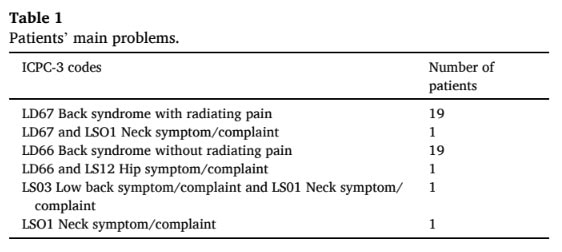 Mezi pacienty, kteří se dostavili na vyšetření, bylo stejné zastoupení pacientů s bolestí dolní části zad bez přidružených příznaků nohou a s bolestí dolní části zad bez přidružených příznaků nohou.
