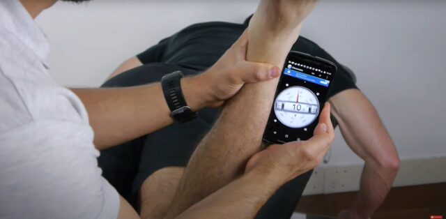 2) Pasivní vnitřní rotace kyčlí <= 25°.Pro posouzení vnitřní rotace leží pacient v poloze na zádech s kyčlemi v neutrální poloze. Flexujte koleno postižené nohy do úhlu 90° a přidržte inklinometr těsně proximálně od laterálního malleolu a poté proveďte maximální vnitřní rotaci kyčle. Maximální ROM je dosaženo, jakmile se kontralaterální hýždě začnou zvedat ze stolu.