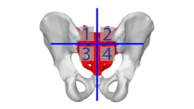 Začněme rozdělením SI kloubu na 4 kvadranty, což usnadní popis umístění rukou.