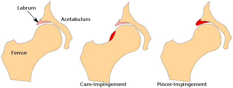 Femoroacetabulært impingement (FAI), også kendt som hofteimpingement, henviser til morfologiske forandringer i acetabulum og/eller lårbenshalsen, som fører til impingement af hoftelabrum under bevægelse. Vi kan skelne mellem to hovedtyper: Når lårbenshovedet er for stort, taler vi om en CAM-morfologi (som er mere almindelig hos mænd), og en overekstenderet acetabulær kant kaldes en Pincer-morfologi, og den er mere almindelig hos kvinder. I en blandet type er der både en CAM- og en Pincer-morfologi til stede.