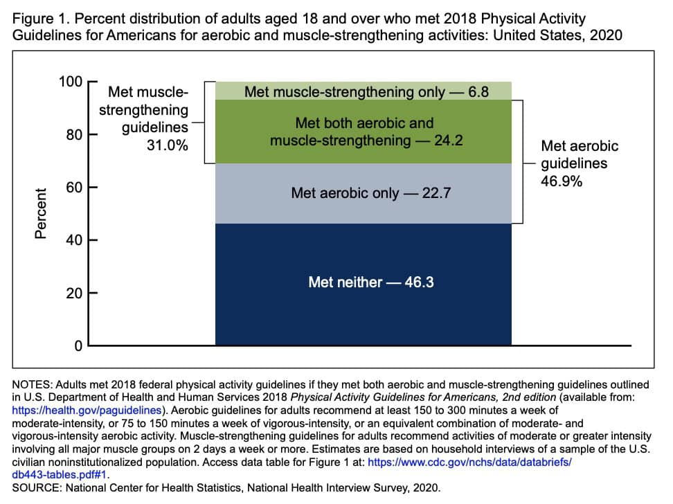 Ein kürzlich in den Vereinigten Staaten durchgeführter Bericht kam zu dem Schluss, dass beispielsweise nur 24,2 % der Erwachsenen sowohl die Richtlinien für aerobe als auch für muskelstärkende Aktivitäten einhalten, wobei fast die Hälfte der Erwachsenen keine der beiden Empfehlungen einhält. Rund 47 % erfüllten die Richtlinien für aerobe körperliche Aktivität, während nur 31 % die Richtlinien für Muskelkräftigung erfüllten.