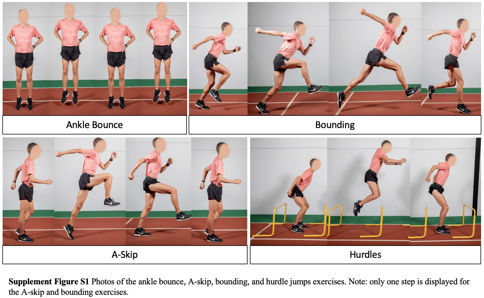 An dieser experimentellen Crossover-Studie nahmen 14 trainierte Langstreckenläufer teil. Die Läufer waren erfahren und liefen im Durchschnitt 86 km pro Woche. Sie waren alle seit mindestens 12 Monaten mit Krafttraining vertraut, bevor sie an der Studie teilnahmen, und waren frei von Verletzungen. Ihr Lauf wurde auf einer 110 m langen Indoor-Laufbahn bei einer Laufgeschwindigkeit von 3,89 m/s analysiert. Außerdem führten sie 4 plyometrische Übungen durch: Sprunggelenk, Hürdensprung, A-Skip und Springen.
