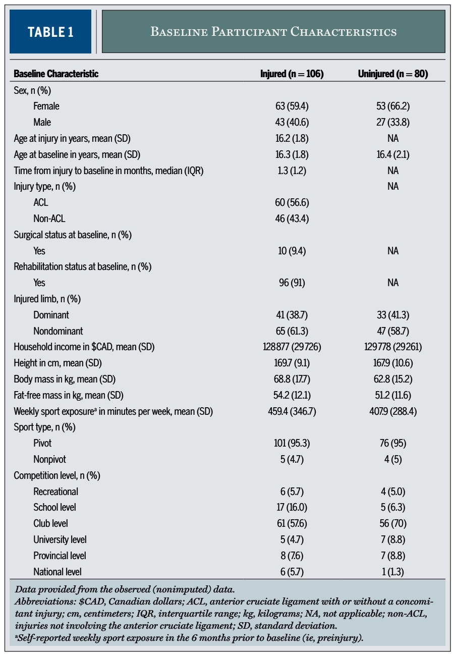 Συνολικά 186 συμμετέχοντες συνεισέφεραν στα δεδομένα, 106 άτομα με κακώσεις στο γόνατο και 80 άτομα χωρίς κακώσεις στο γόνατο.