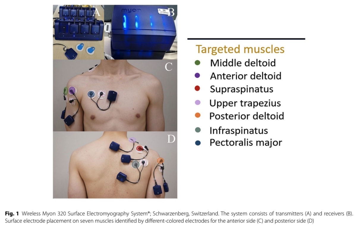 Στη μελέτη αυτή συμπεριλήφθηκαν υγιή άτομα ηλικίας 18-40 ετών. Επιφανειακά ηλεκτρόδια εφαρμόστηκαν πάνω στον πρόσθιο, μεσαίο και οπίσθιο δελτοειδή μυ, στον άνω τραπεζοειδή μυ, στον μείζονα θωρακικό μυ, στον υπερακάνθιο και στον υποπλάγιο μυ.
