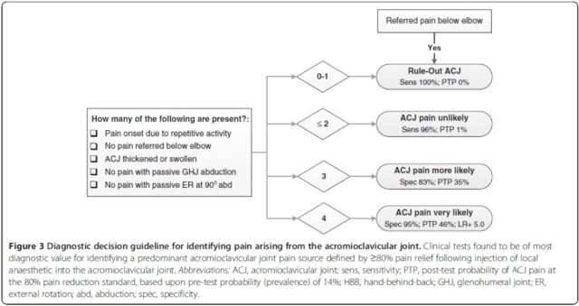 Όλες οι παραδοσιακές φυσικές δοκιμασίες για την άρθρωση της κερκιδικής άρθρωσης βρέθηκαν να έχουν χαμηλή διαγνωστική ακρίβεια σε αυτή τη μελέτη. Συνοπτικά, οι συγγραφείς προτείνουν τον ακόλουθο αλγόριθμο λήψης αποφάσεων για τον εντοπισμό του πόνου που προέρχεται από την ακρωμιοκλειδική άρθρωση: