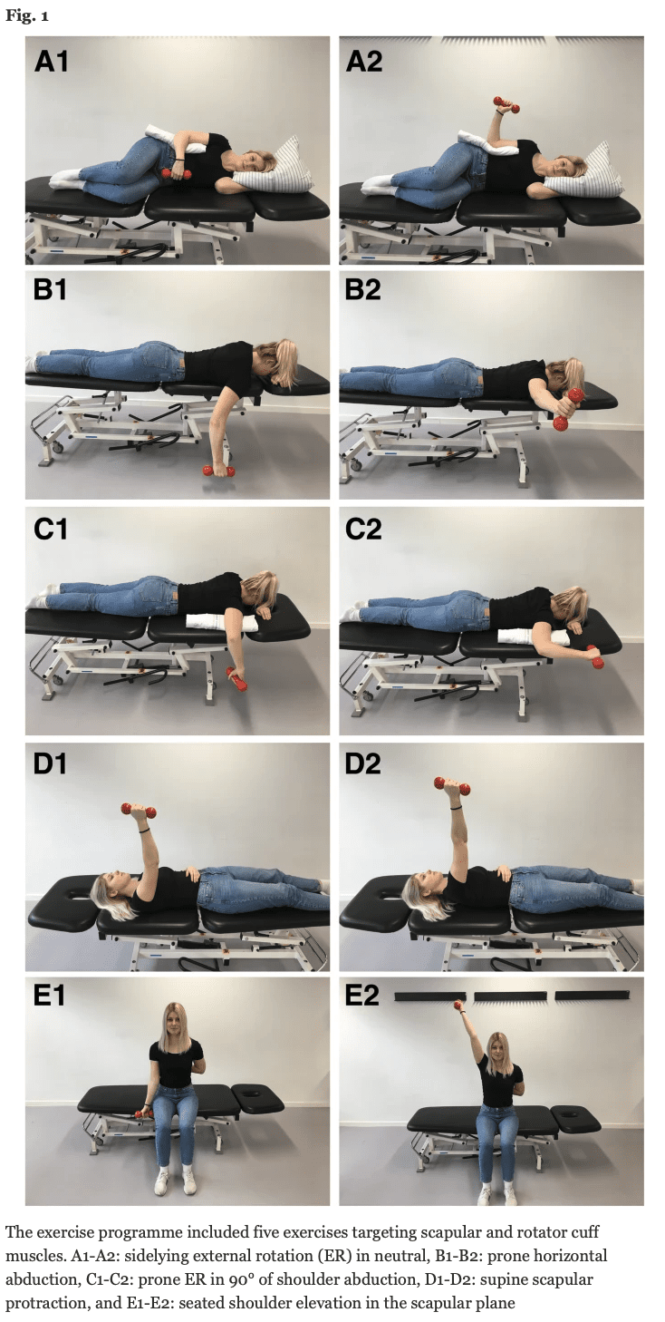 En el grupo de fortalecimiento con cargas bajas, la intención era imitar la práctica asistencial estándar en Dinamarca. Aquí el autoentrenamiento se prescribe regularmente 3 veces por semana. En el estudio, se introdujeron ejercicios a los pacientes y se les supervisó en las semanas 5 y 11, cuando se realizaron los nuevos ejercicios. El programa incluía nueve ejercicios para los hombros: