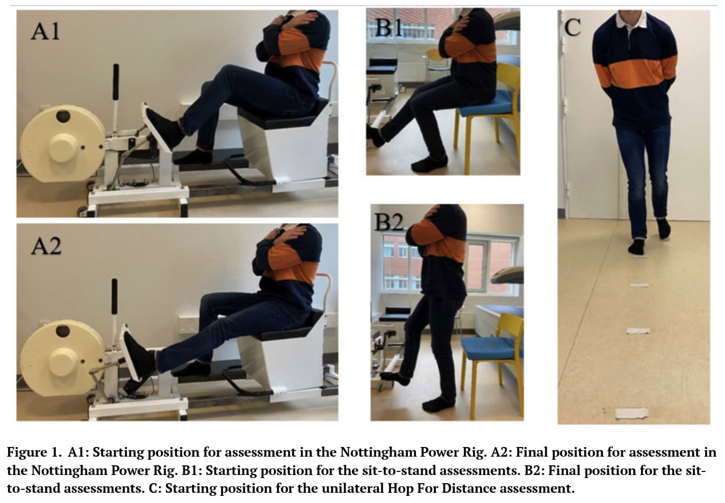 Además, las posiciones en las que se realizan las pruebas son muy diferentes. La plataforma de potencia Nottingham requiere que el participante esté sentado, mientras que las pruebas de rendimiento funcional se realizan de pie. Además, el participante se encuentra en una posición más estática en la plataforma de potencia Nottingham y en las pruebas sentado-parado, mientras que el salto a distancia requiere un movimiento dinámico explosivo. Las pruebas funcionales no se limitan a medir la misma potencia máxima de los extensores de las piernas que el equipo Nottingham; miden el rendimiento en tareas que requieren MÚSCULO, pero en las que también influyen otras capacidades físicas.