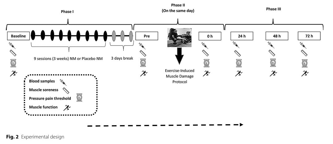 - Tras una pausa de 3 días, la fase 2 comenzó con la repetición de la recogida de muestras de sangre y de datos sobre el dolor y la función musculares, y de PPTs