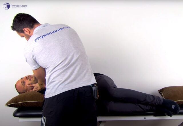 Para realizar la maniobra de Semont, haga que su paciente se siente en el centro del banco de tratamiento con la cabeza apartada del lado derecho afectado. A continuación, coloque rápidamente al paciente en posición lateral hacia el lado afectado con la cabeza girada hacia arriba. Se producirá un nistagmo poco después de llegar a la posición de decúbito lateral y el paciente probablemente experimentará vértigo. Mantenga al paciente en esta posición hasta al menos 20 segundos después de que haya cesado el nistagmo. Algunos incluso recomiendan hasta 1-2 minutos.