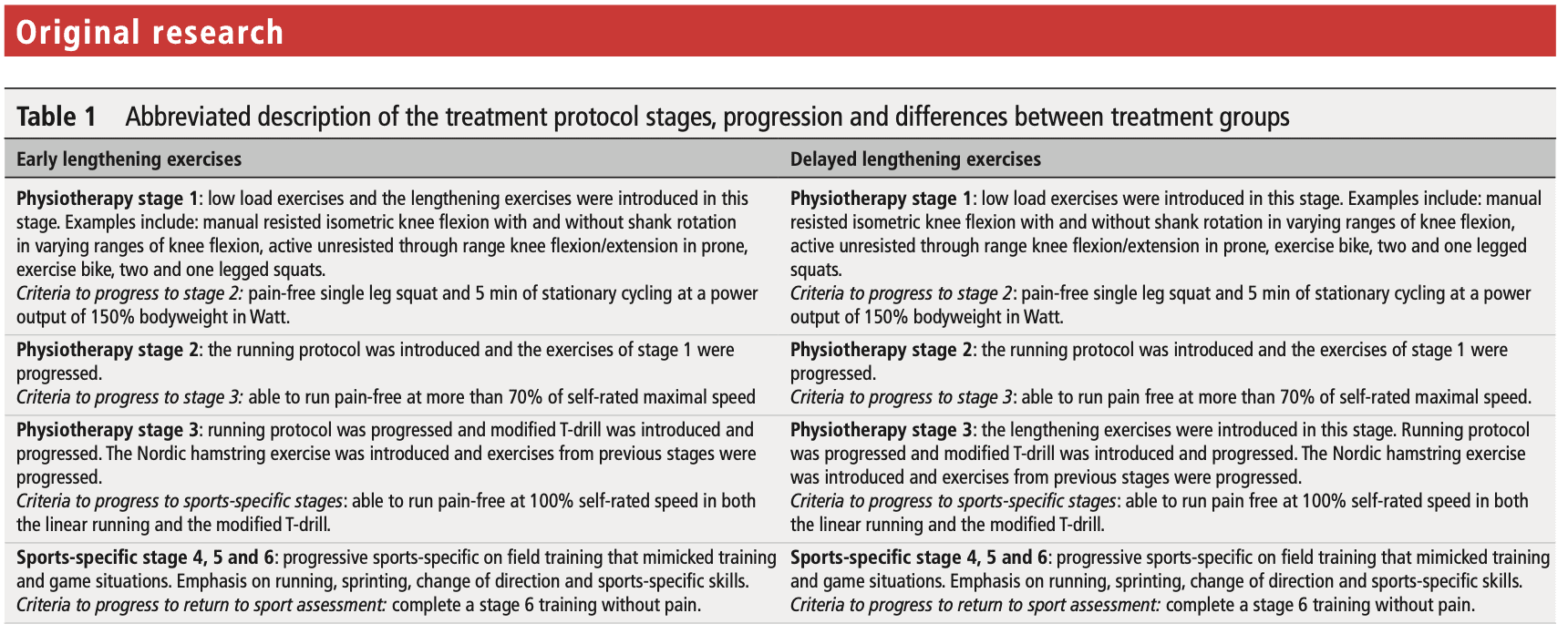 Molemmat ryhmät noudattivat tavanomaista kriteereihin perustuvaa kuntoutusohjelmaa, joka koostui 6 vaiheesta: 3 fysioterapiaan perustuvaa vaihetta ja 3 urheilukohtaista vaihetta. Ryhmät erosivat toisistaan pidennysharjoitusten aloittamisen ajankohdan suhteen. Varhaisen pidennyksen ryhmässä pidennysharjoitukset aloitettiin ensimmäisenä kuntoutuspäivänä, kun taas myöhäisen pidennyksen ryhmässä pidennysharjoitukset aloitettiin sen jälkeen, kun oli täytetty kriteerit, joiden mukaan juokseminen oli mahdollista yli 70 % itse arvioidusta maksiminopeudesta.