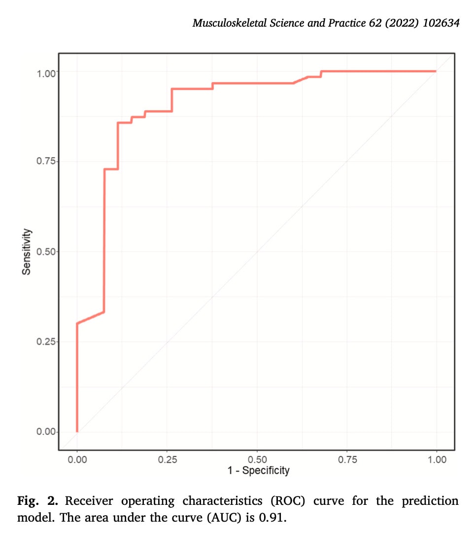 Itse juoni on jonkin verran vaikeasti luettavissa, koska pisteviiva ei näy niin selvästi. Se voi kuitenkin auttaa sinua ennusteessasi ja antaa sinulle käsityksen siitä, voiko manuaalisesta hoidosta olla hyötyä tälle potilaalle. Näet, että korkea CSI-pistemäärä (joka osoittaa sentraalista herkistymistä) yhdessä negatiivisen hoito-odotuksen ja suun avautumiskivun kanssa, joka on suurempi kuin 2/10, johtaa hyvän lopputuloksen todennäköisyyteen, joka on alle 10 %. Potilailla, joilla on sentraalisen herkistymisen komponentti, voidaan odottaa parempia tuloksia, kun heidän biopsykososiaalinen kontekstinsa otetaan huomioon sen sijaan, että keskityttäisiin pelkästään biomekaanisiin seikkoihin. Jos haluat tietää tästä lisää, suosittelen, että seuraat Jo Nijsin kurssia kanssamme! Erityisen mielenkiintoista oli se, että standardoidun hoidon sijaan tässä tutkimuksessa pyrittiin yksilölliseen hoitoon, ja vaikka tässä tutkimuksessa ei tutkittu hoidon vaikuttavuutta, kannustan voimakkaasti tähän hoitotapaan!