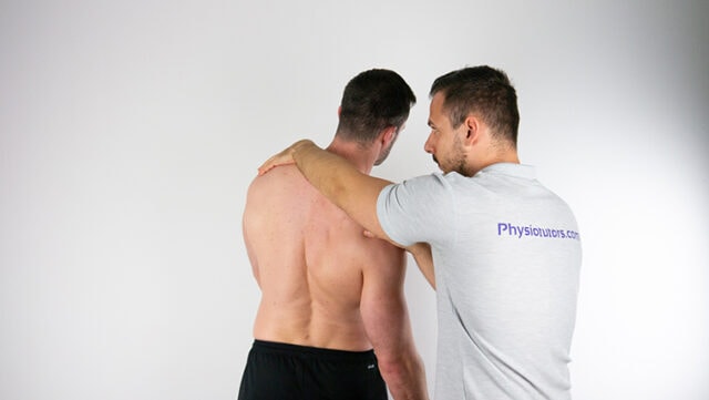 Testin suorittamiseksi potilas seisoo. Auta potilasta ojentamaan selkäranka maksimaalisesti pitämällä kiinni hartioista.