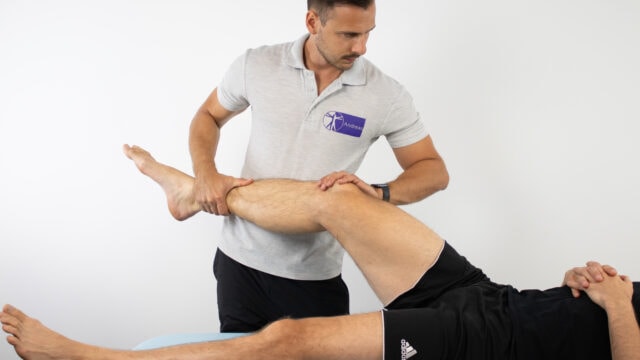 Kun pidät valgusmomentin yllä, ojenna jalkaa hitaasti ja anna sen siirtyä sisäkiertoon. Työnnä myös reisiluun päätä eteenpäin oikean käden peukalolla.