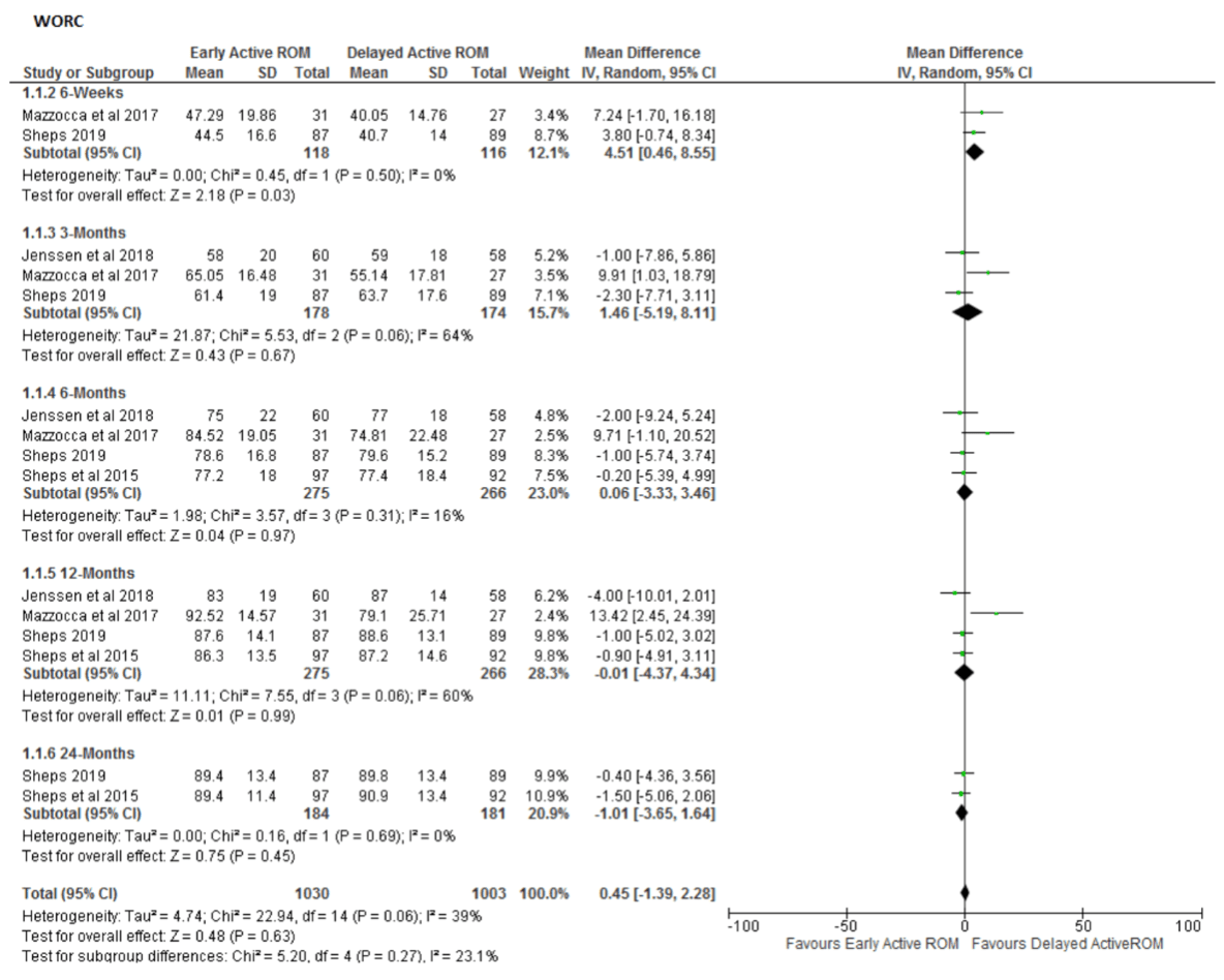 Des données de haute qualité indiquent qu'une plus grande amplitude de mouvement en flexion active vers l'avant et en abduction a été observée dans le groupe des mouvements actifs précoces à 6 semaines, mais cette différence a disparu aux autres points dans le temps. Il en va de même pour la rotation externe, pour laquelle les bénéfices s'étendent à 3 et 6 mois. Le mouvement précoce n'a pas entraîné de différences au niveau de la rotation interne ou de la force.