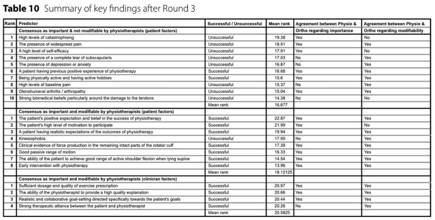 Osamdeset osam stručnjaka završilo je 1. krug, a 70 sudionika ostalo je kroz 3. krug, što predstavlja stopu zadržavanja od 79,54%. U početku su generirane 344 izjave, od kojih je 45 prediktora identificirano u 1. krugu. Dvadeset i dva prediktora postigla su konsenzus o važnosti za predviđanje ishoda fizioterapije, a od njih su 12 faktora fizioterapeuti smatrali modifikabilnima. Oni se mogu podijeliti na 4 čimbenika kliničara i 8 čimbenika bolesnika.
