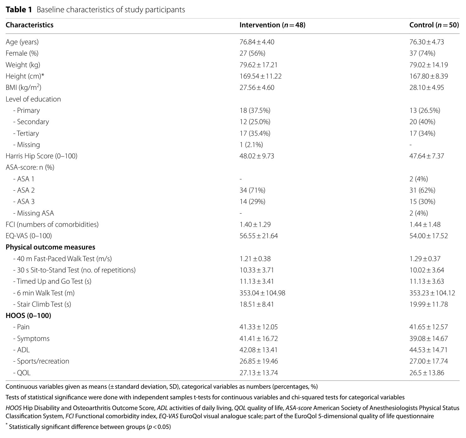 Ninety-eight individuals were recruited and randomly allocated to the intervention group (n=48) or control group (n=50). The participants were on average 76 years old and had a Harris Hip Score of 48.02 in the intervention group and 47.64 in the control group. The groups were equal at baseline, except for height, with the intervention group being approximately 2 centimeters taller.