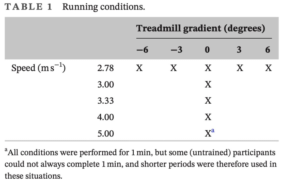 Először a résztvevők egy 8 perces futást végeztek 2,78 m/s sebességgel a futópad megismerése érdekében. Ezután 4 percet futottak 3,33 m/s sebességgel, hogy meghatározzuk az általuk preferált lépésszámot. Több 1 perces futást végeztek különböző sebességeken, emelkedőn vagy lejtőn. A futások sorrendje randomizált volt. Az összes lejtőn végzett futás 2,78 m/s sebességgel történt. A lejtős futásokat követően a résztvevők 3,33 m/s sebességgel futottak, az általuk preferált lépésszámot használva. Ezután megkértük őket, hogy fussanak nagyobb lépésszámmal (+10 lépés percenként) és kisebb lépésszámmal (-10 lépés percenként), követve egy metronóm ütemét.
