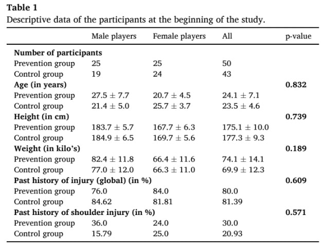 Férfi játékosoknál a vállsérülések kockázata szignifikánsan alacsonyabb volt a prevenciós csoportban a kontrollcsoporthoz képest, 0,253 kockázati aránnyal (95% CI 0,057 – 1,118). Ezt úgy számítottuk ki, hogy a kontrollcsoportban a játékosok 31,6%-a szenvedett vállsérülést, szemben az intervenciós csoport 8%-ával.