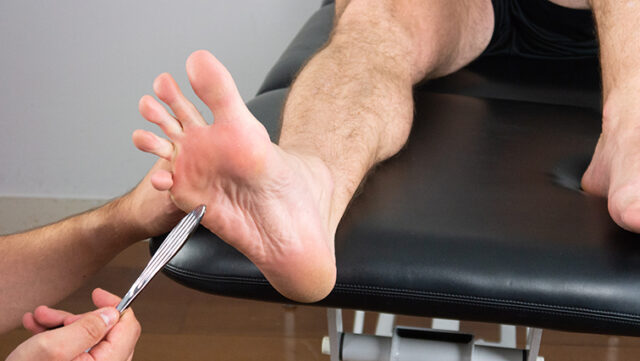 A Babinski-reflex vizsgálatához húzz végig egy hegyes tárgyat a saroktól a láb lateralis oldalán előre, a nagylábujj irányába.
