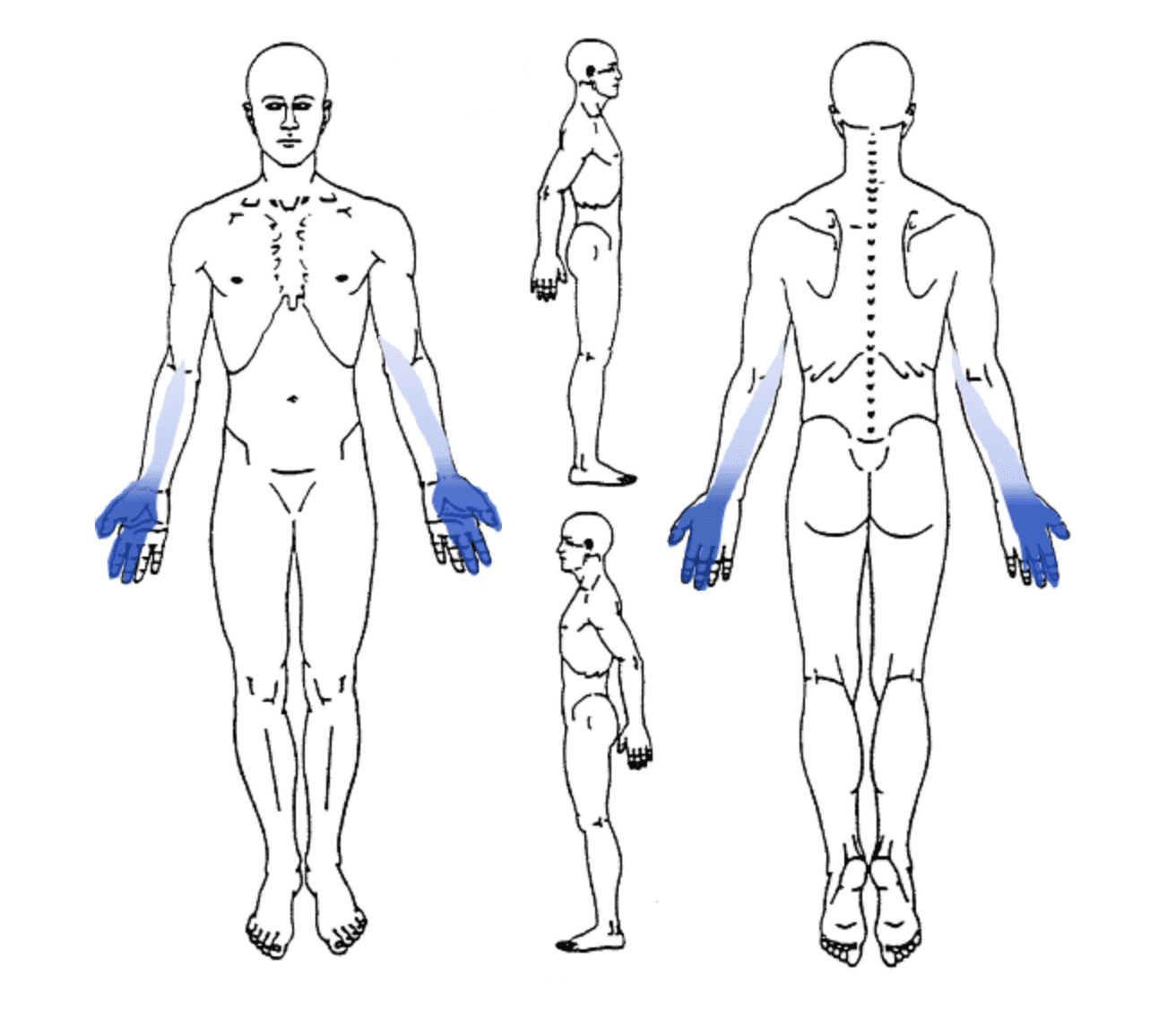 Sensasi kesemutan/parestesia di ibu jari hingga jari tengah yang menjalar ke lengan bawah. Presentasi bilateral dimungkinkan