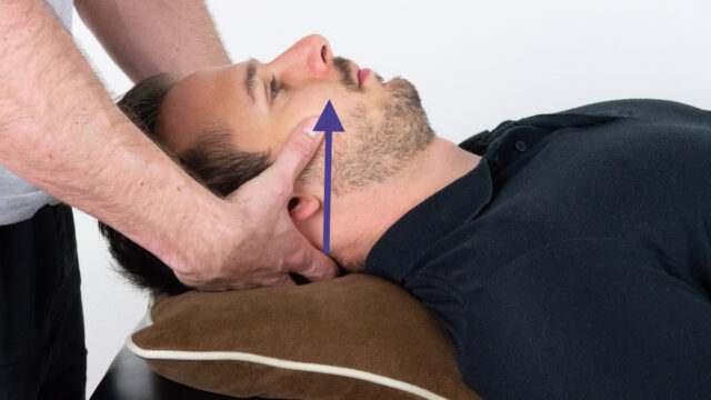Kemudian, topanglah oksiput pasien di telapak tangan Anda dan jari-jari ke-3 hingga ke-5, sementara kedua jari telunjuk ditempatkan di ruang antara oksiput dan proses spinosusC2, sehingga keduanya berada di atas lengkung saraf atlas.