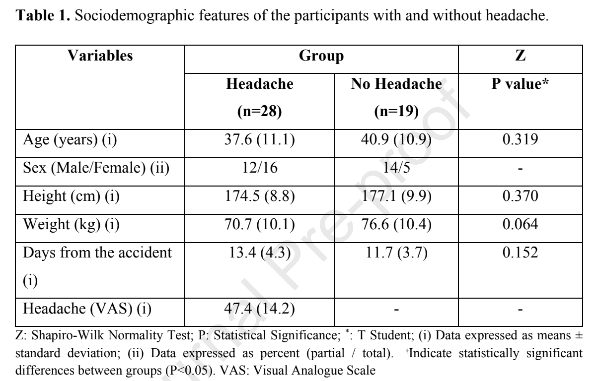 L'unica differenza, non riportata nella tabella, è che il gruppo di persone con colpo di frusta e cefalea era composto da cinque partecipanti che soffrivano di mal di testa prima che si verificasse il colpo di frusta (emicrania e cefalea di tipo tensivo). Mentre nessuno dei controlli soffriva di cefalee pregresse.