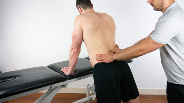Al paziente viene chiesto di flettere la schiena in avanti con entrambe le mani sul bordo del tavolo di trattamento.