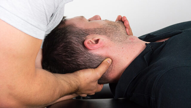 Quindi, applica una pressione sull'arco posteriore di C1 con un pollice e usa l'altra mano per ruotare la testa omolateralmente, sollecitando così l'articolazione atlanto-occipitale.