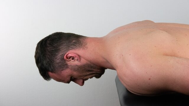 患者をうつ伏せに寝かせ、頭頸部をテーブルの端から離し、頸胸郭接合部を安定させた状態で、患者にあごを引いた姿勢をニュートラルで20秒間維持するように指示する。 頸部深層伸筋の弱さを示すポジティブな所見として、傾斜計で観察されるように、頸部の伸展に伴って「あごの長さ」が長くなることが挙げられるが、これは頸部の表層伸筋が優位であることを示している。