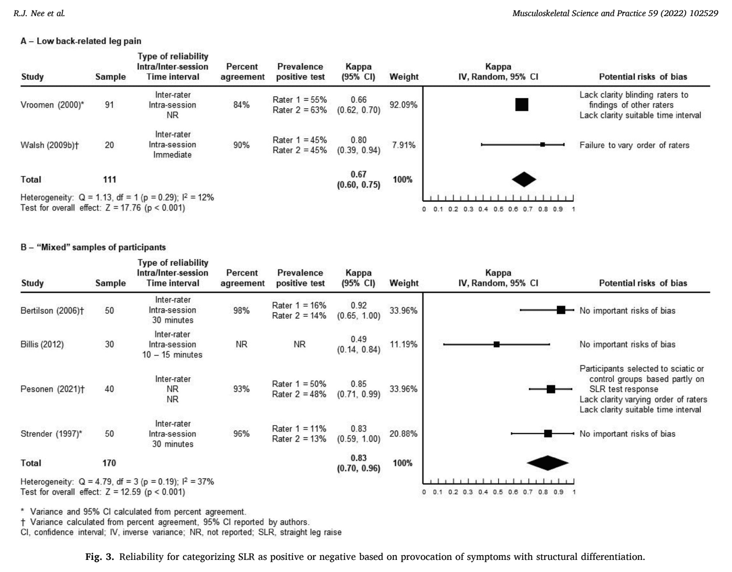 메타 분석 결과, 요통 관련 다리 통증이 있는 환자에서는 평가자 간 신뢰도가 중간 정도였고, 구조적 차별화를 통해 SLR을 실시한 혼합 환자 표본에서는 상당한 신뢰도가 있는 것으로 나타났습니다. (그림 3a 및 3b)