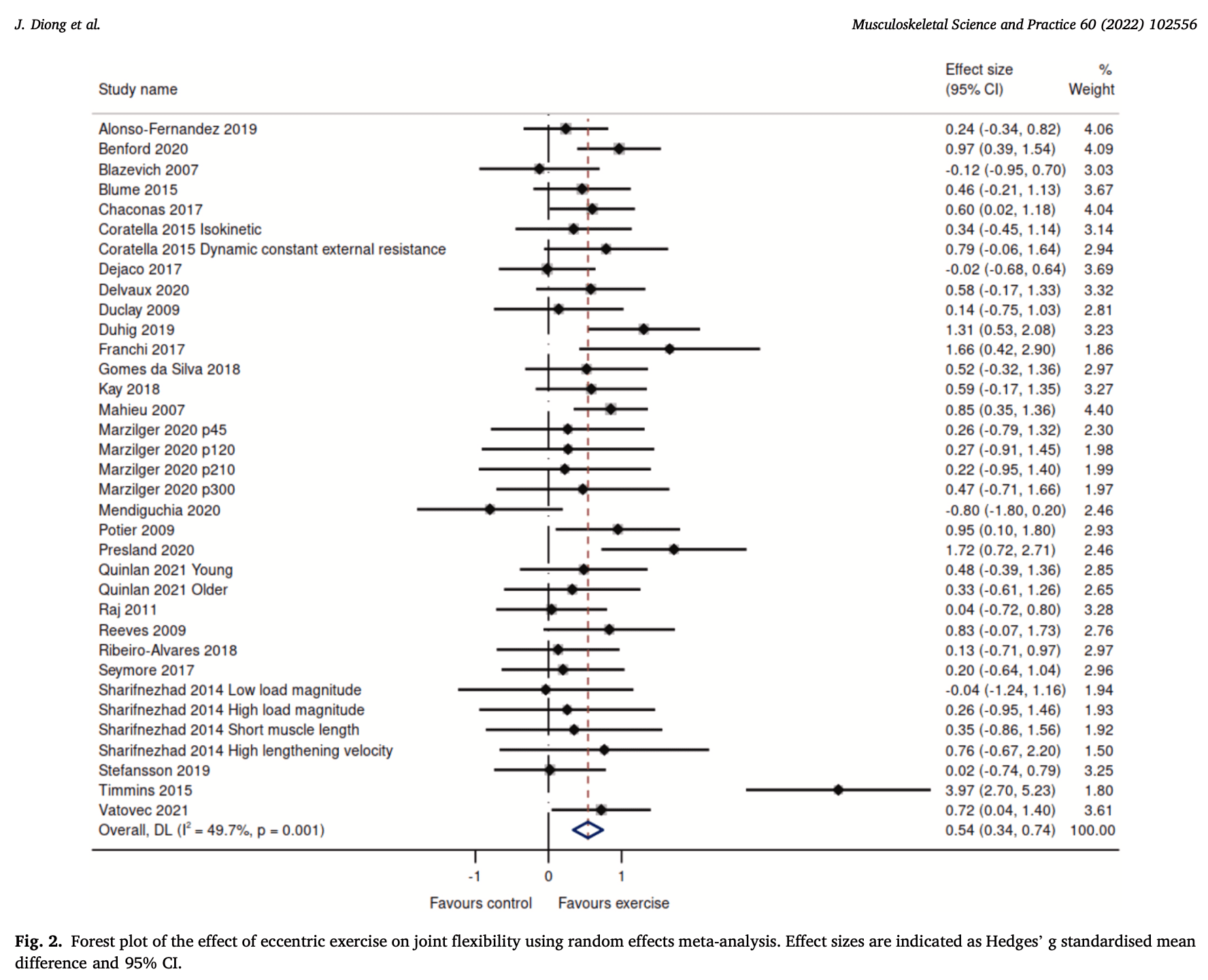 Rekken en strekken is al heel lang de optie om de flexibiliteit van de spieren bij een gevarieerde populatie te vergroten. Bij neurologische aandoeningen werd stretchen gebruikt om spiercontracturen te voorkomen, bij atleten werd gedacht dat het spierpijn na de training zou verminderen en zelfs in de fysiotherapie was het een bekende methode om de flexibiliteit rond verschillende gewrichten te vergroten. Maar de onderzoekstrein blijft maar rijden en daaruit bleek dat stretchen niet noodzakelijk leidde tot verbeteringen in atletische prestaties, een afname in blessures door alle oorzaken of overbelasting en zelfs bij mensen met neurologische blessures was stretchen niet in staat om contracturen te voorkomen of te behandelen. Het lijkt er dus op dat stretchen zijn plaats verliest in revalidatie of atletische training. De laatste jaren wordt er meer aandacht besteed aan excentrische oefeningen. Omdat deze vorm van oefening de spier laat verlengen tijdens het samentrekken, werd gedacht dat dit een betere strategie zou kunnen zijn. In 2012 rapporteerden O'Sullivan et al. al dat excentrische oefening de flexibiliteit van de heup, knie of enkel kon verbeteren, maar de conclusies van dit onderzoek waren gebaseerd op ongepoolde gegevens, zodat de grootte van het effect onbekend bleef. Bij de biceps femoris was excentrische training in staat om een grote toename in spierfasculelengte te veroorzaken. Daarom werd gedacht dat soortgelijke bevindingen ook in andere lichaamsregio's zouden kunnen worden verkregen. Deze systematische review gaf een update van de vorige studie en bevatte ook een meta-analyse om te kijken naar de effectiviteit van excentrische oefening op flexibiliteitsmetingen.