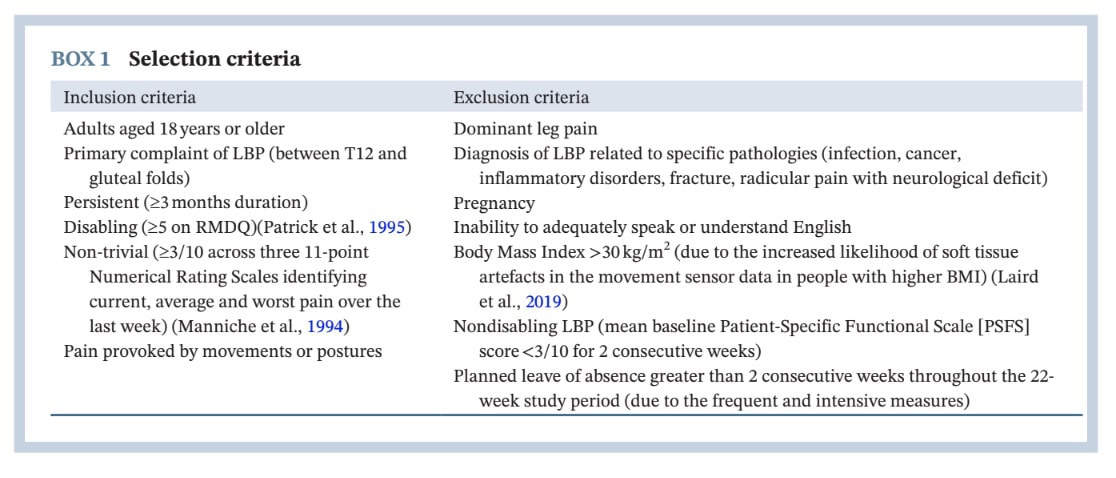 Deze populatie had veel last van lage rugpijn en leed daar al jaren onder. Ze hadden in de loop der jaren meerdere zorgverleners geraadpleegd en gebruikten vaak medicijnen voor hun lage rugpijn. Velen hadden gemeld dat ze veel afwezig waren geweest vanwege hun lage rugpijn. Als zodanig omvatte dit onderzoek een populatie van mensen die al vele jaren op verschillende niveaus waren getroffen.
