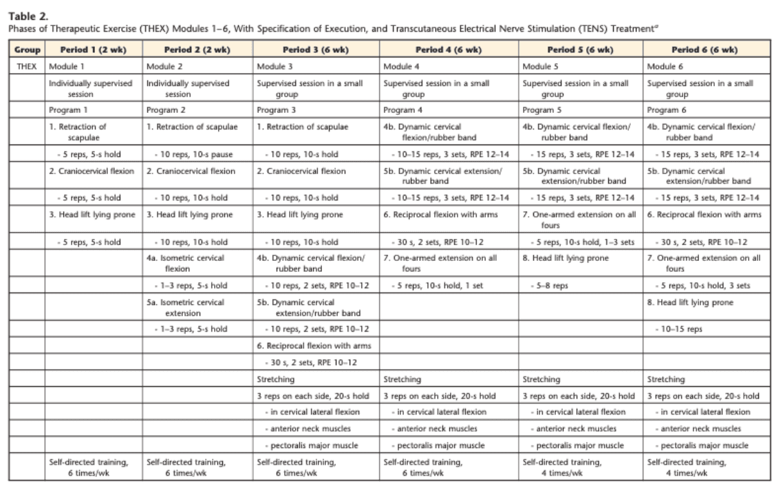 De interventiegroep voltooide een progressief nek-schouder oefenprogramma van 6 maanden, bestaande uit zes modules. In de eerste drie modules werden oefeningen met lage belasting uitgevoerd, terwijl de overige modules specifieke krachtoefeningen voor de nek en het bovenlichaam vereisten, aangevuld met rekoefeningen. De eerste en tweede module werden individueel begeleid en de overige vier in kleine groepen. Een aanvullend oefenprogramma voor thuis werd begeleid door een instructieboekje en video's. Hier kregen de deelnemers het advies om de eerste 4 modules (de eerste 3 maanden) ten minste 6 keer per week en de laatste 3 maanden 4 keer per week het thuisoefenprogramma uit te voeren.