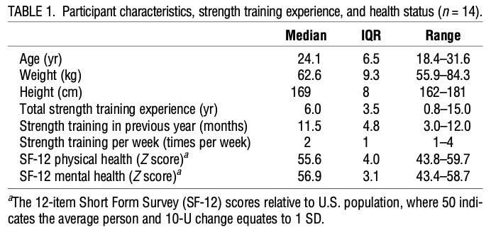 W okresie zaznajamiania się z ćwiczeniami określono maksymalne 12 powtórzeń przy użyciu protokołu testowania rampy w celu określenia względnego obciążenia intensywności dla każdego ćwiczenia. Wykonano każde ćwiczenie, a w przypadku, gdy można było wykonać 12 powtórzeń, zwiększono ciężar o około 1,25-2,5 kg w przypadku ćwiczeń z hantlami i sztangą po 1-2 minutach odpoczynku. Ostateczny opór został określony, gdy nie można było wykonać 12 powtórzeń lub nie można było utrzymać ścisłej techniki.