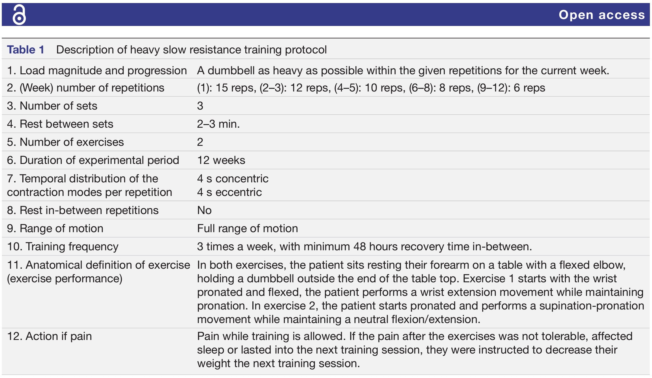 - Próba zbadania ciężkiego powolnego treningu oporowego w bocznej epicondylalgii, gdzie dowody są skąpe. Wykorzystuje odpowiednie miary wyników (PRTEE, siła chwytu), ale nie można poprzeć samej ambicji twierdzenia o "najwyższej skuteczności" na podstawie tak małego programu pilotażowego.