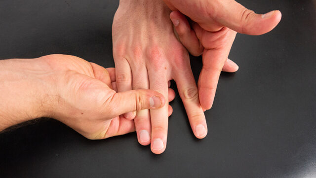 W przypadku mięśni międzykostnych grzbietowych spleć palce między palcami pacjenta i poproś go, aby ścisnął je tak mocno, jak to możliwe. Sprawdź, czy różnice są zauważalne.