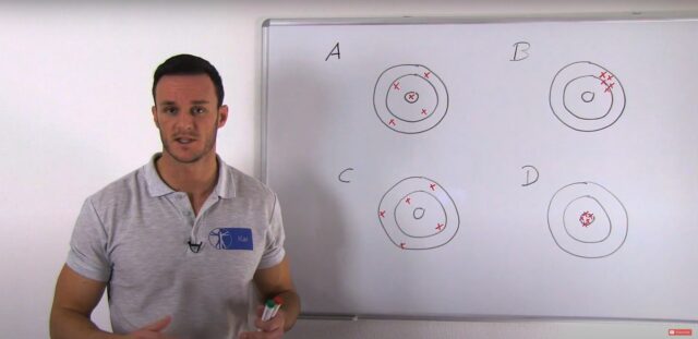 No cenário A, acertamos o alvo por acaso, portanto, esse dardo foi preciso, enquanto todos os outros dardos foram cobertos por todo o alvo, portanto, tivemos uma precisão ruim ou, em outras palavras, pouca confiabilidade. Um exemplo poderia ser o teste de pivot-shift para uma ruptura do LCA, que é um teste preciso e difícil de executar. Portanto, se você não for treinado, pode ser que seus resultados não sejam consistentes.