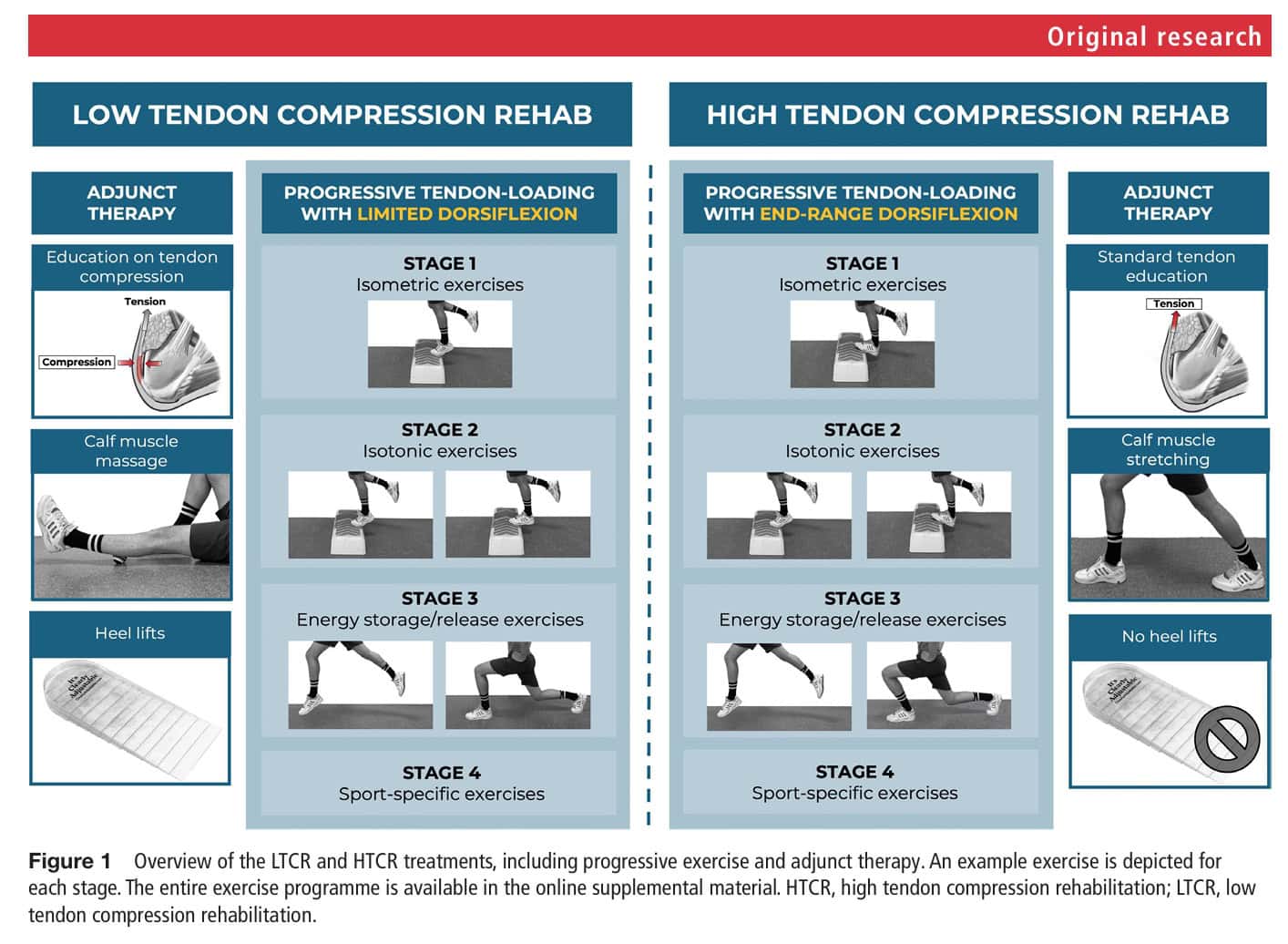 Ao eliminar a dorsiflexão do tornozelo e, portanto, o componente de compressão durante os exercícios, este ensaio mostrou uma estratégia eficaz para melhorar a tendinopatia de Aquiles insercional. Este efeito manteve-se após 24 semanas, embora o limite inferior dos intervalos de confiança apontasse para um efeito pouco claro. Utilizando elevadores de calcanhar e evitando o alongamento da barriga da perna e a dorsiflexão do tornozelo ao longo da reabilitação, elimina a compressão sobre a inserção do tendão de Aquiles. Ao carregar progressivamente os tendões em 4 fases, a capacidade de carga é gradualmente restaurada.