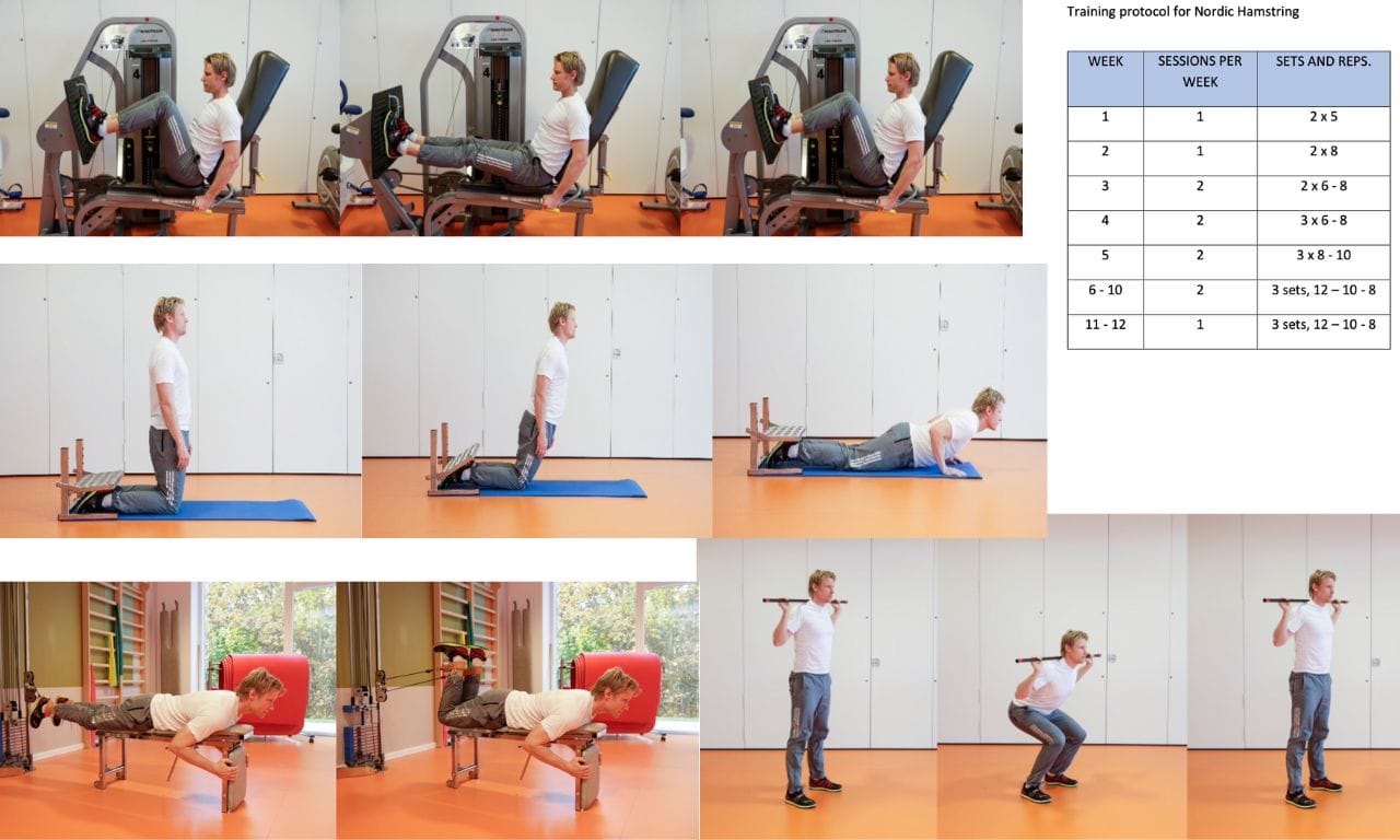 No grupo de fortalecimento progressivo, os participantes completaram 60-70 minutos de sessões supervisionadas duas vezes por semana durante 12 semanas. Este programa consistia em 8 exercícios que foram realizados em 3 séries de 10 repetições a uma intensidade de 12 repetições máximas. Os exercícios realizados incluíam leg press, leg curls deitados, agachamentos com uma barra atrás da cabeça, exercício nórdico para os isquiotibiais.