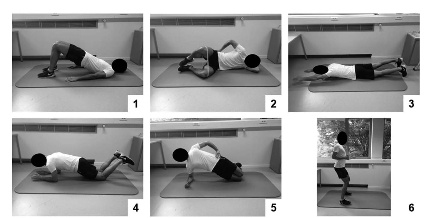 Core exercises were: glute bridge, glute clam, lying diagonal back extension, adapted knee plank, adapted knee side plank, elastic band shoulder retraction with a hip hinge.