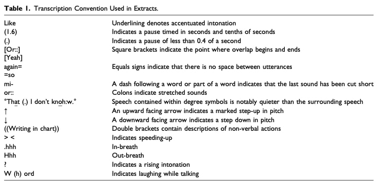 Consultațiile înregistrate video au fost mai întâi transcrise textual de transcriptori profesioniști pentru a stabili o înregistrare de bază a interacțiunilor. Aceste transcrieri au fost apoi rafinate folosind notația Jeffersonian detaliată, care păstrează caracteristicile fine ale discursului - inclusiv pauzele, intonația, suprapunerile și prozodia - precum și comportamentele non-verbale relevante (de exemplu, privirea, gesturile, postura) notate în context. Acest nivel de detaliu a fost esențial pentru a înțelege nu doar ce s-a spus, ci și cum a fost transmis și primit.