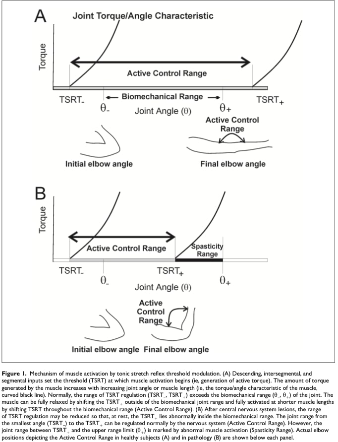 Измеряемый в градусах, TSRT представляет собой угол наклона сустава - в локте - при котором мышца начинает сопротивляться растяжению без приложенной скорости движения. У людей, перенесших инсульт, аномальные значения TSRT отражают нарушение двигательного контроля. Более высокие значения TSRT указывают на повышенную спастичность (гиперактивные рефлексы), в то время как более низкие значения указывают на уменьшение диапазона суставов, где происходит аномальная активация мышц.