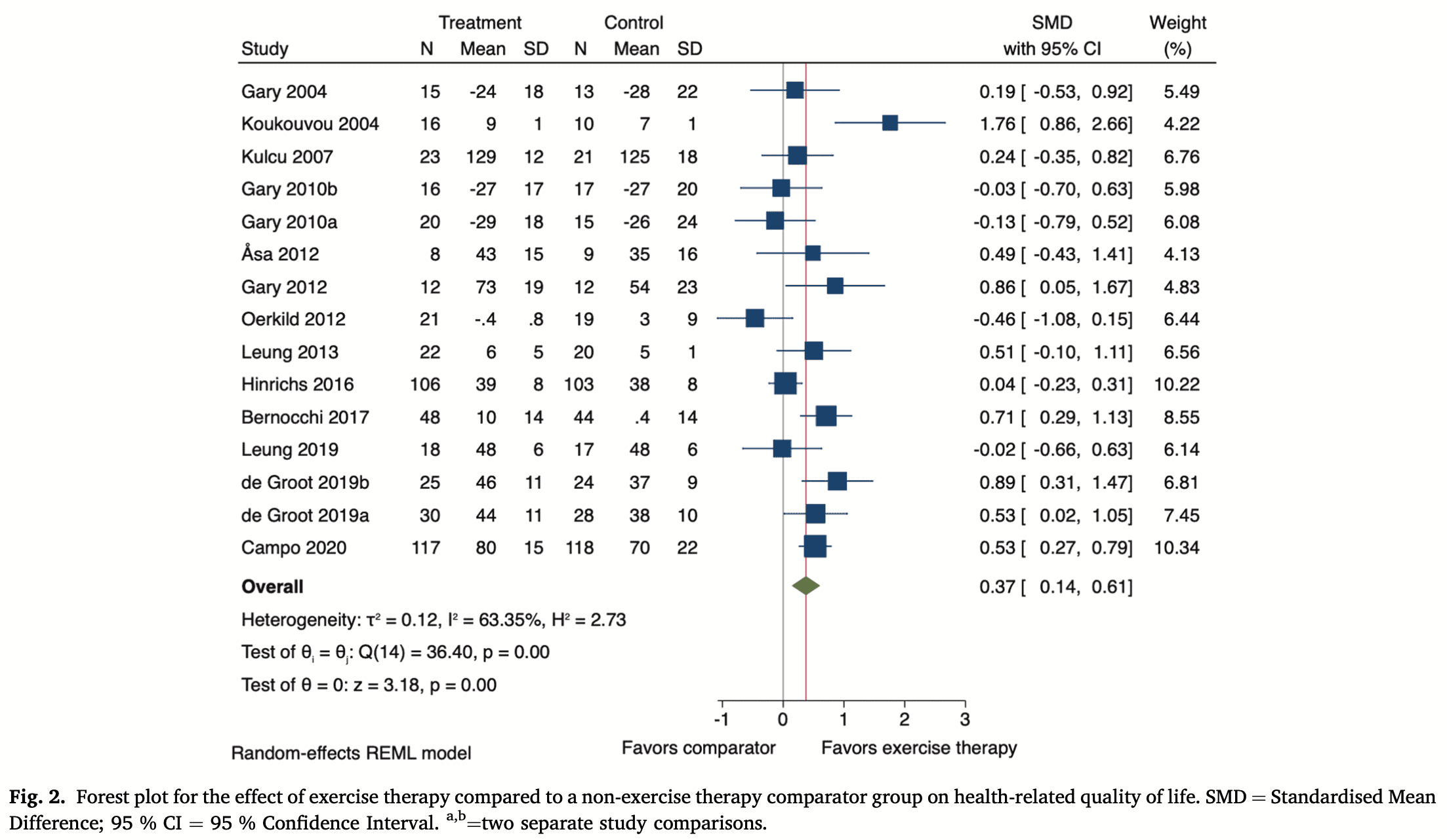Было обнаружено, что терапия упражнениями со средней продолжительностью тринадцать недель вызывает небольшое улучшение качества жизни, связанного со здоровьем, но этот вывод сопровождается значительной неоднородностью. Метарегрессия показала, что увеличение возраста связано с меньшим размером эффекта, а это значит, что чем моложе пациент, тем больше улучшений можно ожидать.