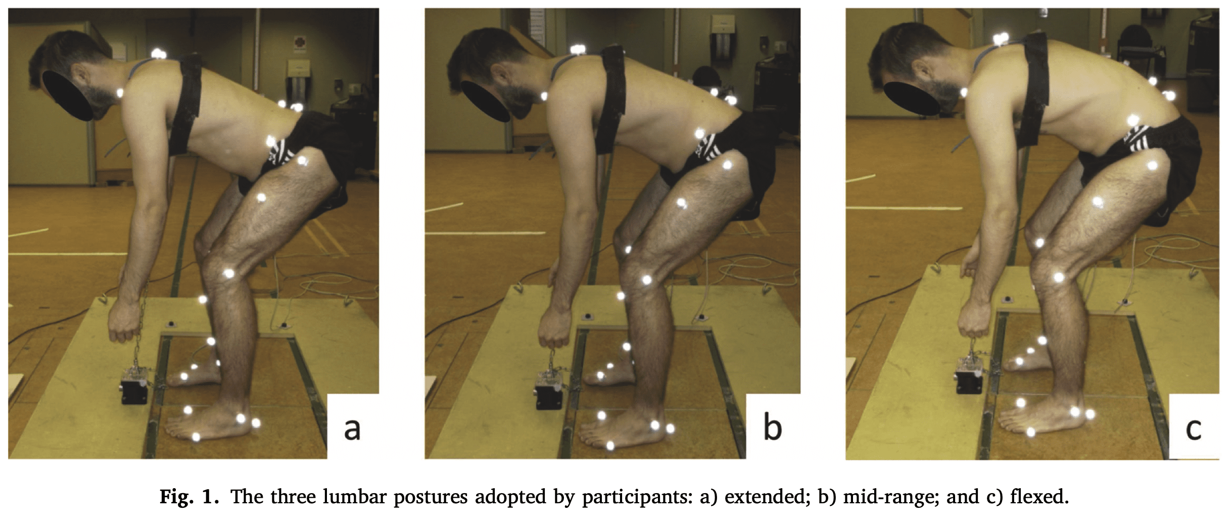 Vključenih je bilo 26 zdravih udeležencev (13 moških in žensk). Pomemben glavni učinek za držo je pokazal razliko v trenutku iztegovalke hrbta med upognjeno in sredinsko držo, sredinsko in iztegnjeno držo ter upognjeno in iztegnjeno držo. Položaj v ledvenem delu ni vplival na trenutke v kolkih in kolenih.