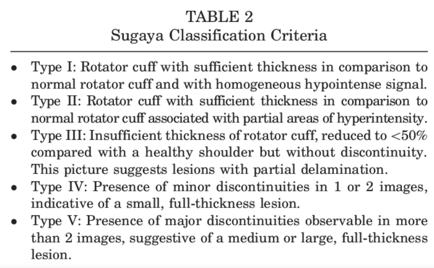 Vključitev samo študij 1. in 2. stopnje ter vključitev popolnih raztrganin rotatorne manšete v ta pregled spodbuja homogenost ugotovitev. Za stratifikacijo analiz je bil uporabljen rehabilitacijski protokol skupine MOON, tako da konservativna rehabilitacija temeljila na obstoječih in realnih časovnih okvirih.